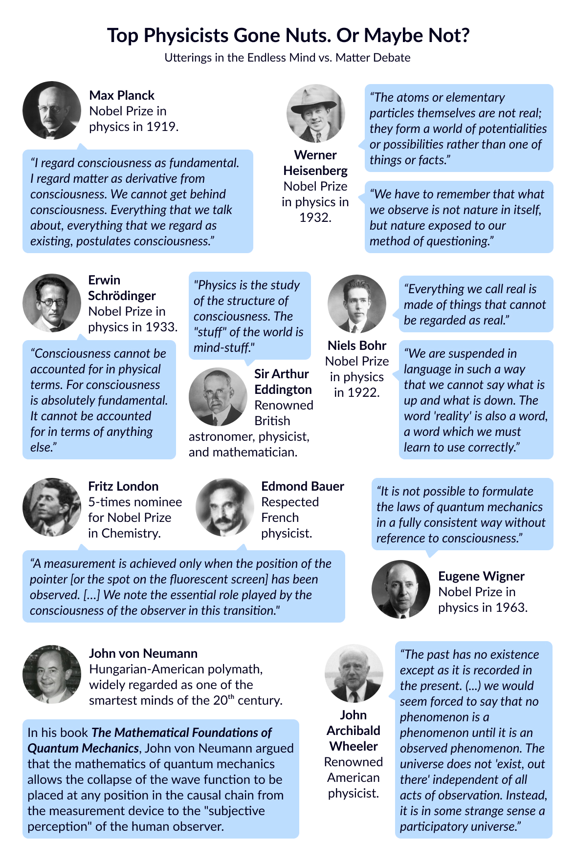 B: For what it’s worth, I’m not alone. While it’s not the mainstream view, some of the greats in physics have expressed thoughts in this direction. Let me mention a few of them in the following figure.